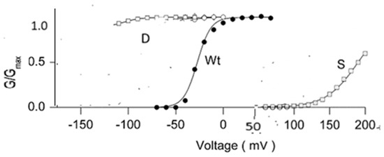 - Chowdhury, S.; Haehnel, B.M.; Chanda, B. Interfacial gating triad is crucial for electromechanical transduction in voltage-activated potassium channels. J. Gen. Physiol. 2014, 144, 457–467. [Google Scholar] [CrossRef] [PubMed]