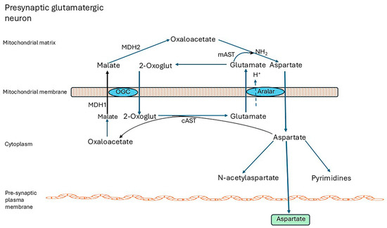 The MAS is essential for maintaining redox balance in the cytosol and mitochondria, for securing and transferring the energy generated as NADH in the cytosol, and for neuronal use of lactate as fuel. By regenerating NAD+, it enables the activities of cytosolic enzymes to continue and other NAD+ functions such as signalling and regulation of transcription by sirtuins [116]. Importantly, it generates aspartate for export from neurons for subsequent uptake by astrocytes where it has a central role in glutamine synthesis (refer to Section 4.2). Aspartate is also essential for pyrimidine synthesis [121] and is converted to N-acetylaspartate (NAA) and exported to oligodendrocytes, where it is de-acetylated and metabolized, and provides acetate for fatty acid synthesis [117,122,123]. In humans, aralar deficiency presents with severe infantile-onset encephalopathy with epilepsy, global developmental delay, generalized hypotonia, loss of cerebral volume, diffuse brain atrophy, hypomyelination/white matter loss, and reduced cerebral NAA on brain imaging [25,117,124,125]. Infants lacking other shuttle enzymes, GOT2, MDH1, or MDH2, have exhibited similar symptoms [116,126,127,128], which are mirrored in aralar-KO mice [129,130]. Brain Asp levels of KO mice were 80% to 90% lower than controls. Asp and NAA levels of brain and cortical neuronal cell cultures from all brain regions of KO animals were drastically decreased and alanine (Ala) and serine (Ser) were severely reduced [131].