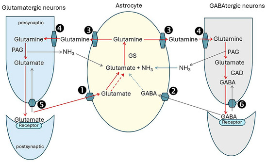 Glutamine (Gln) and GABA for neurotransmission are synthesized and replenished by the interaction of glutamatergic and GABAtergic neurons and astrocytes in a tightly co-ordinated sequence termed the glutamate/GABA/glutamine cycle. Because neurons lack the capacity to synthesize glutamate (Glu) de novo, astrocytes are the primary regulators of Glu and GABA biosynthesis [132,133]. Figure 3 shows the sequence of events. The legend explains how it operates and lists the main transporters and enzymes involved.