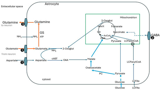By releasing glutamate and GABA, neurons are at the frontline of neurotransmission. However, their capacity to do this is entirely dependent on support from adjoining astrocytes to maintain the glutamine flow [133,137]. This involves complex biochemical interactions. The problem is that the glutamate/GABA/glutamine cycle is a leaky system. Not all of the glutamate from glutamine transferred into neurons is used for neurotransmission. Some 10% to 30% is diverted to cell metabolism [138]. Without replacing this, the neurotransmitter pool would be exhausted very rapidly [132]. Astrocytes bolster supplies by withdrawing 2-oxoglutarate (2OG) from their TCA cycle. Transamination by cytosolic AST yields glutamate for glutamine synthesis. However, this depletes the TCA of an essential component with the risk of rapid malfunction. This is prevented by anaplerotic activities [139] shown in Figure 4 and described in the legend. Pyruvate carboxylase, which carboxylates pyruvate to oxaloacetate, has a central role in anaplerosis. It is expressed abundantly in astrocytes [140,141].