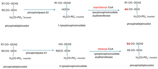 Remodelling of phosphatidylinositides by the Lands cycle. The phosphatidylinositides (PIs) synthesized de novo have a miscellany of fatty acyl groups. Phospholipase A1 or A2 removes the acyl chains at sn-1 or sn-2, respectively, leaving a lysophosphoinositide. The new, required acyl groups (shown in red) are transferred to this from stearoyl-CoA or arachidonyl-CoA. PIs incorporated into glycosylphosphatidylinositol (GPI)-anchored proteins are remodelled by the same process, but with replacement of flexible unsaturated fatty acyl chains at sn-2 with rigid stearate chains transferred from stearoyl-CoA [127,227]. Polyunsaturated acyl groups located at the sn-2 position have a rapid turnover. Synthesis, remodelling, and recycling of phospholipids are highly active processes with high ATP consumption [228,229]. AA arachidonic acid, SA stearic acid.