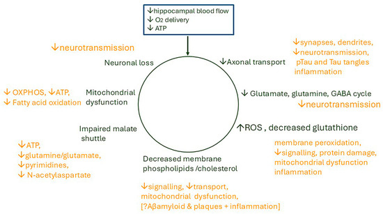 The review explores the notion that recurrent minor ischaemic events due to a reduction in hippocampal blood flow (hypoperfusion) cause episodes of ATP depletion. These are proposed to initiate cellular disturbances which cascade, provoke an inflammatory response, and result in cumulative damage. This combines two concepts which are not new, but it seems timely to review them in light of recent findings. There are four main sections: (i) a brief summary of changes which occur normally in an ageing brain; (ii) a large section covering sensing of ATP depletion, processes with very heavy ATP consumption (the malate shuttle, the glutamate/glutamine/GABA (γ-aminobutyric acid) cycle, and axonal transport), and the consequences of ATP deficiency on lipid turnover, membrane function, neurotransmission, and synapses; (iii) a section covering hippocampal perfusion, responses of cerebral blood flow to hypoxia, neuronal activity and intraluminal pressure, and reduced flow in hypertension and chronic hypoxia; and (iv) an overview of recent genomic studies relevant to the proposal. From the review, the conclusions are that there are strong scientific arguments for the proposal, that there is supportive evidence, and that these lines of enquiry should be pursued. Studies are already indicating new approaches for preventative interventions, early diagnosis, and therapy.