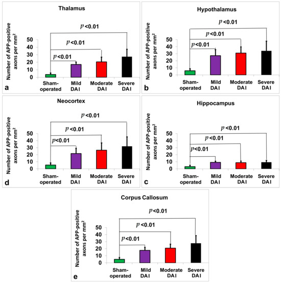 Quantification of β-APP-positive axonal profiles across different brain regions in sham-operated, mild, moderate, and severe DAI groups. Graphs show the number of β-APP-positive axons per mm2 in the (a) thalamus, (b) hypothalamus, (c) hippocampus, (d) neocortex, and (e) corpus callosum. All DAI groups exhibited significantly increased β-APP staining compared to the sham group (p < 0.01). Axonal pathology increased with injury severity across all regions. Bars represent mean ± standard deviation.