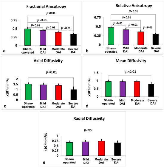 Diffusion MRI metrics measured 48 h after DAI across injury severity groups compared to sham-operated controls. (a) FA, (b) RA, (c) AD, (d) MD, and (e) RD were quantified from whole-brain regions of interest. FA, RA, AD, and MD values significantly declined with increasing injury severity. No significant group differences were observed for RD. Bars represent mean ± standard error. NS = not significant.