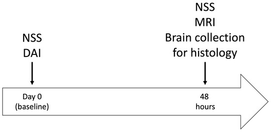 Experimental timeline. NSS—neurological severity score; DAI—diffuse axonal brain injury; MRI—magnetic resonance imaging.