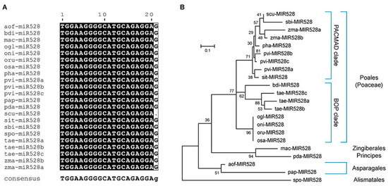 The sequence alignment and phylogenetic analysis of miR528. (A) Alignment of mature miR528 sequences. miR528 derived from 17 monocot plant species, including Asparagus officinalis L. (aof), Brachypodium distachyon (L.) P.Beauv. (bdi), Musa acuminata Colla (mac), Oryza glaberrima Steud. (ogl), Oryza nivara S.D.Sharma and Shastry (oni), Oryza rufipogon Griff. (Oru), Oryza sativa L. (osa), Panicum hallii Vasey (pha), Panicum virgatum L. (pvi), Phalaenopsis aphrodite Rchb.f. (pap), Phoenix dactylifera L. (pda), Saccharum hybrid cultivar (scu), Setaria italica (L.) P. Beauvois (sit), Sorghum bicolor (L.) Moench (sbi), Spirodela polyrhiza (L.) Schleid. (spo), Triticum aestivum L. (tae), and Zea mays L. (zma). The black-shaded blocks indicate highly conserved residues. (B) The phylogenetic tree reconstructed with precursors of miR528. We aligned the miR528 precursor sequences of all the 17 monocot plant species using Molecular Evolutionary Genetics Analysis (MEGA) version 6.06 software [31] with MUltiple Sequence Comparison by Log-Expectation (MUSCLE) and reconstructed the phylogenetic tree using the maximum likelihood (ML) method using the general time reversible (GTR) substitution model with the default set of gamma distribution among-site rate variation. To compare the similarities and differences of the ML phylogenetic tree, we also reconstructed the phylogenetic tree with the maximum parsimony (MP) method using MEGA (Supplementary Figure S1). The phylogenetic tree of the 17 monocot plants used in the study was gathered from Monocots Plant Annotated Genomes Database (PLAZA) 4.5 (https://bioinformatics.psb.ugent.be/plaza/, accessed on 6 December 2024) [32]. The 17 monocot plants belong to five orders of the Liliopsida. The five orders are as follows: Alismatales, Asparagales, Principes, Zingiberales, and Poales. Poaceae is a large and nearly ubiquitous family of monocotyledonous flowering plants known as grasses, containing two sister lineages (or clades): the Panicoideae, Arundinoideae, Chloridoideae, Micrairoideae, Aristidoideae, and Danthonioideae (PACMAD) clade and the Bambusoideae, Oryzoideae, and Pooideae (BOP) clade. The name of the PACMAD clade comes from the first initials of the six included subfamilies, i.e., Panicoideae, Arundinoideae, Chloridoideae, Micrairoideae, Aristidoideae, and Danthonioideae [33]. The BOP clade contains three subfamilies from whose initials its name derives: bamboos (Bambusoideae); Oryzoideae, including rice; and Pooideae, including important cereal crops such as wheat [34].