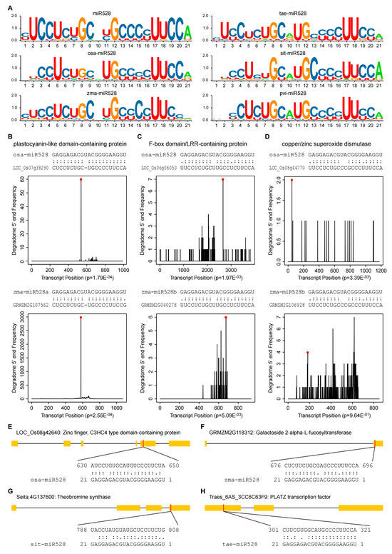 The target genes of miR528. (A) The sequence logos of miR528 target sites. Toolkit for Biologists integrating various biological data handling tools (TBtools) was used to draw the sequence logos (https://github.com/CJ-Chen/TBtools/, accessed on 25 December 2024) [38]. The sequence logos of miR528 target sites are conserved in rice, corn, wheat, millet, and switchgrass. These conserved target genes encode three types proteins, including plastocyanin-like domain-containing proteins, F-box domain- and (or) leucine-rich repeat (LRR)-containing proteins, and the copper/zinc superoxide dismutase. osa-miR528, zma-miR528, tae-miR528, sit-miR528, and pvi-miR528 represent the sequence logos of all the predicted miR528 target sites in rice, corn, wheat, millet, and switchgrass, respectively. (B–D) The conserved target genes of miR528. The target genes of miR528 were predicted by searching the transcripts for complementary sequences using the psRNATarget server with a more stringent cut-off threshold: maximum expectation (E) = 3.0 (https://www.zhaolab.org/psRNATarget/, accessed on 26 December 2024) [36]. Degradome sequencing data were downloaded from the PmiREN database. The upper parts of B-D present the alignments of miR528 with its target sequences, and the lower parts are the frequency of the 5′ end of the degradome tags within the full-length target transcripts. The solid lines indicate matched RNA base pairs. One dot shows G-U mismatch, and two dots represent other types of mismatch. (B) LOC_Os07g38290 and GRMZM2G107562, encoding a plastocyanin-like domain-containing protein, are the targets of miR528 in rice and maize, respectively; (C) LOC_Os06g06050 and GRMZM2G040278, encoding F-box domain- and (or) LRR-containing proteins, are the targets of miR528 in rice and maize, respectively; (D) LOC_Os08g44770 and GRMZM2G106928, encoding a copper/zinc superoxide dismutase, are the targets of miR528 in rice and maize, respectively. (E–H) Examples of non-conserved target genes of miR528 predicted in different monocot species, including genes involved in flowering regulation, glycosylation, alkaloid biosynthesis, and transcriptional regulation. The black line represents intron, the rectangle filled yellow represents exon, and miRNA complementary sites (red) are shown. The RNA sequences of each complementary site from 5′ to 3′ and the miR528 sequence from 3′ to 5′ are shown in the expanded regions.