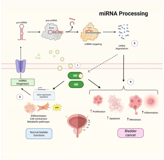 Interplay between NRs and miRNAs in bladder homeostasis and cancer. NRs regulate gene expression by binding to specific ligands and modulating transcriptional programs involved in cell differentiation, contraction, and metabolism, contributing to normal bladder functions (1,2). miRNAs, which are synthesized through canonical biogenesis pathways involving Dicer and the RNA-induced silencing complex (RISC), fine-tune gene expression posttranscriptionally (3). Cross-regulation occurs as NRs modulate miRNA biogenesis and transcription, whereas miRNAs regulate NR expression, establishing feedback loops. Dysregulation of these interactions contributes to BCa pathophysiology by increasing proliferation, metastasis, inflammation, and evasion of apoptosis (4). Solid black straight arrows indicate direct sequential processes, red and black up arrows indicate increased activity, while dashed arrow represents inhibition process. Created with BioRender.com (accessed on 1 May 2025).