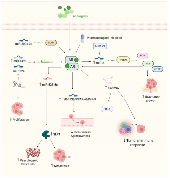 Androgen receptor (AR) signaling network and its regulation by ncRNAs in BCa. The figure illustrates key molecular interactions involved in AR signaling and its downstream effects in BCa. Androgen binding activates AR, promoting tumor progression through the PI3K/AKT/mTOR axis, immune evasion, and tumor growth. AR also modulates the expression of various ncRNAs, including miR-21, miR-525-5p, miR-4736, and circRNAs, which contribute to increased proliferation, invasion, and metastasis. Conversely, tumor-suppressive miRNAs, such as miR-124, miR-449a, and miR-200a-3p, negatively regulate AR or its downstream targets, thereby limiting proliferation and vascular mimicry. Pharmacological inhibition, the use of miRNA inhibitors (ADM-21), and AR-miRNA crosstalk represent potential therapeutic strategies to modulate aggressiveness and immune escape in BCa. Solid straight black arrows indicate activation, red and black up arrows indicate increased expression, red and black down arrows indicate repressed activity, dashed red and black arrows represent inhibition process. Created with BioRender.com (accessed on 1 May 2025).