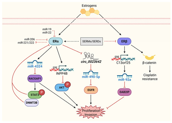 The relationship between ERs and miRNAs in BCa further complicates their functional roles. miR-92a, a well-established oncogenic miRNA, is upregulated in ERβ-positive BCa cell lines. This miRNA is induced by ERβ binding to its host gene C13orf25 and induces cell proliferation and invasion by downregulating the tumor suppressor DAB2IP [38]. In contrast, miR-490-5p suppresses EGFR expression and is induced by ERα through the inhibition of circ_0023642, which acts as a sponge for miR-490-5p. This sponge function results in reduced invasiveness in BCa cells, suggesting that ERα-induced miR-490-5p expression may be a protective mechanism against tumor metastasis [61].
