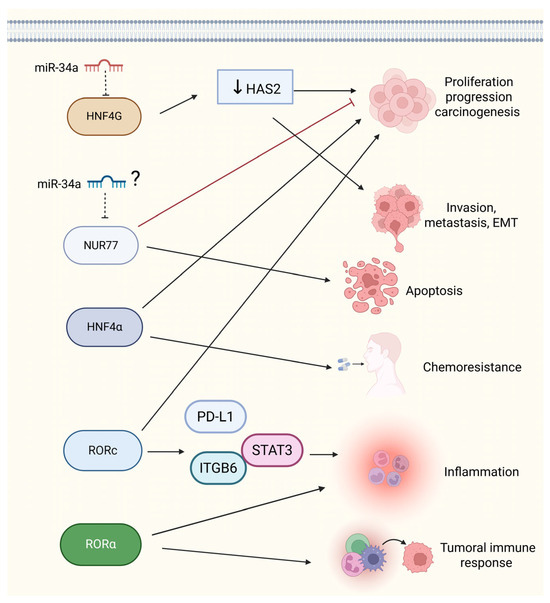 Molecular roles of ONR and its regulation by miRNAs in BCa progression. Several RNRs play pivotal roles in BCa through the modulation of tumor cell behavior and interaction with the tumor microenvironment. HNF4G, which is directly targeted by miR-34a, promotes proliferation and progression via hyaluronan synthase 2 (HAS2). Nur77 and HNF4α influence apoptosis, invasion, and chemoresistance, although the regulation of Nur77 by miR-34a in BCa remains to be clarified. RORC activates the PD-L1/ITGB6/STAT3 signaling axis, thereby enhancing inflammation and therapy resistance. Additionally, RORα may regulate tumor immune responses. These ONR-mediated pathways represent potential targets for therapeutic intervention in BCa. Question mark (?) indicates speculative not validated function, solid straight black arrows indicate activation, dashed black arrow represents indirect inhibition, black down arrow indicates repressed activity and solid red arrow indicates direct inhibition process. Figure created with BioRender.com (accessed on 1 May 2025).