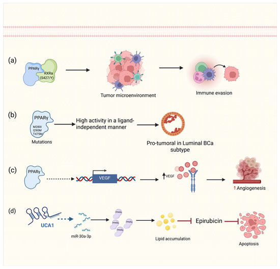 Roles of PPARγ and PPARα in BCa. (a) The formation of the PPARγ heterodimer with RxRa (S427/Y) regulates the tumor microenvironment by inhibiting the expression of inflammatory cytokines, leading to a state of immune evasion. (b) PPARγ point mutants transform cells into PPARγ-dependent cells by activating the pathway without the need for a ligand. (c) PPARγ transcriptionally activates the VEGF promoter via an indirect mechanism. (d) Through the microRNA miR30a-3p, the lncRNA UCA1 increases the expression of PPARα, which accumulates lipids that prevent epirubicin-induced apoptosis. Solid straight arrows indicate activation, dashed black and blue arrows indicate indirect activation, up black and red arrows indicate increased expression, red arrows represents inhibition process. Figure created with BioRender.com (accessed on 1 May 2025).
