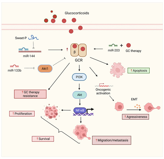 Moreover, miR-133b was identified as a regulator of GCR-related pathways, specifically targeting AKT1, which can contribute to glucocorticoid resistance [54,129]. These findings underscore the potential of combining miRNA modulation with GCR signaling to improve treatment efficacy. Restoring tumor-suppressive miRNAs or inhibiting oncogenic miRNAs may sensitize BCa cells to glucocorticoid treatment and other therapies. For example, the use of miR-203 mimics or enhancers alongside glucocorticoids has been shown to increase apoptosis in BCa cells, suggesting the therapeutic potential of combined miRNA and glucocorticoid treatment [130,131,132] (Figure 6).