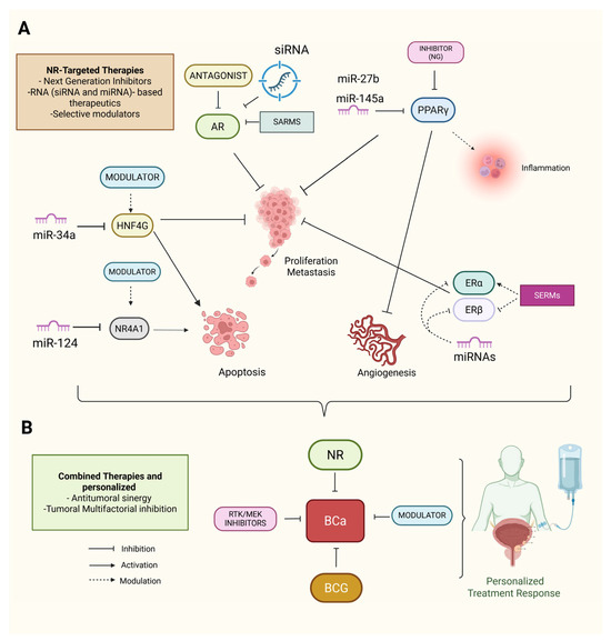NR-targeted strategies and RNA-based therapeutics in BCa. (A) Schematic highlighting major therapeutic approaches directed at NRs implicated in BCa progression. AR antagonists (e.g., enzalutamide), PPARγ agonists, SERMs, SARMs, and next-generation NR inhibitors have demonstrated potential in modulating tumor cell proliferation and survival. RNA-based therapies, including miRNA mimics (e.g., miR-34a targeting HNF4G) and siRNA knockdown of AR, offer a complementary strategy involving interference with NR expression and activity. Additional miRNAs, such as miR-145, miR-124, and miR-27b, have been shown to modulate NR-related pathways, including PPARγ, VDR, and NR4A1 signaling, thus affecting inflammation, apoptosis, and therapeutic resistance. (B) Combining strategies integrating NRs and RNA-based tools may increase therapeutic efficacy and offer avenues for personalized BCa management. Solid straight black arrows indicate direct activation, curved dashed black arrows indicate indirect inhibition, dashed black arrows indicate indirect activation. Created with BioRender.com (accessed on 1 May 2025).