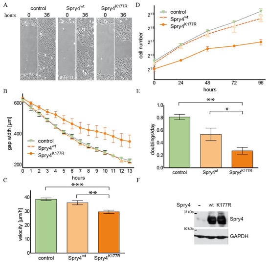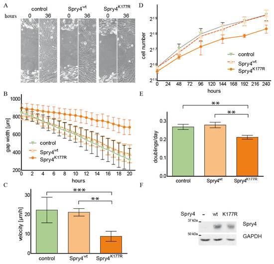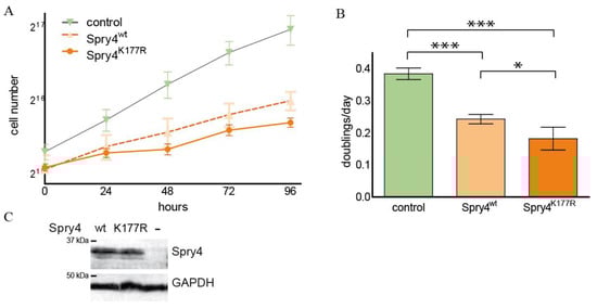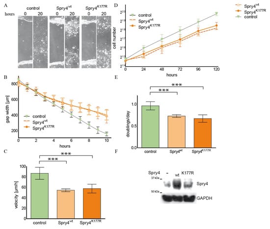 Accordingly, the growth curve shows that the slope of the cell number per hour in the control-treated CRL2868 cells was much steeper compared to the parallel determined increase in the cell population expressing one of the Spry4 protein variants (Figure 5D). Again, there was no obvious difference between the doublings per day as calculated for the two Spry4-expressing study groups (0.73 ± 0.03 and 0.67 ± 0.03 doublings/day for Spry4wt and Spry4K177R, respectively), while the control cells doubled almost once (0.97 ± 0.02) per day (Figure 5E). Ectopic expression of Spry4 in CRL2868 cells was achieved in each experiment (Figure 5F).