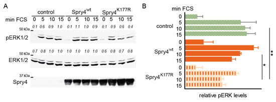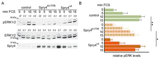 These data demonstrate that concomitant with the inhibition of proliferation and migration, Spry4 with a substitution of lysine 177 to arginine interferes with serum-mediated signalling inducing ERK phosphorylation.