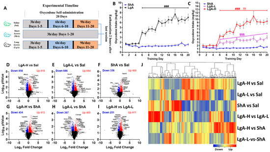 Insights into oxycodone self-administration: Experimental timeline, behavioral data, RNA sequencing analysis (A) Experimental timeline, Saline (n = 8), Short-access (ShA) (n = 10) rats, and Long-access (LgA) (n = 18). (B) Oxycodone intake by LgA and ShA groups. (C) LgA rats show two distinct intake phenotypes, high (LgA-H) (n = 11) and low (LgA-L) (n = 7), based on their drug intake. Volcano plots (D) LgA-L vs. Sal, (E) LgA-L vs. Sal, (F) ShA vs. Sal, (G) LgA-H vs. ShA, (H) LgA-L vs. ShA, (I) LgA-H vs. LgA-L illustrating the number of significant genes (p < 0.05) between each pairwise comparison. (J) Hierarchical clustering for DEGs that met the criterion of 1.5-fold change and p < 0.05, with blue indicating downregulated genes, and red indicating upregulated genes. Key to statistics: ### = p < 0.001, comparison of LgA-H to ShA rats; !!! p < 0.001, comparison of LgA-H to LgA-L rats; $$$ p < 0.001, comparison of LgA-L to ShA rats.