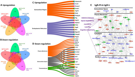 Identification of gene and molecular network in the LgA-H animals in comparison to LgA-L. (A) The Venn diagram shows significant upregulated genes (p < 0.05, fold change 1.5 F). (B) This Venn diagram shows significant downregulated genes (p < 0.05, fold change 1.5 F). Sankey diagrams (Sankeymatic.com/build) reveal molecular functions for genes that were (C) upregulated and (D) downregulated in the LgA-H vs. LgA-L comparison. (E) Ingenuity Pathway Analysis (IPA, https://digitalinsights.qiagen.com/products-overview/discovery-insights-portfolio/analysis-and-visualization/qiagen-ipa/, accessed on 26 July 2025) shows the molecular networks for DEGs in the LgA-H vs. LgA-L comparison. The red color represents upregulated genes, whereas the green color represents downregulated genes, and the blue color represents interacting partners.