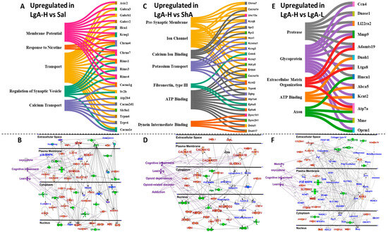 Identification of altered molecular networks in the LgA-H rats in comparison to Sal, ShA, and LgA-L. (A) Sankey diagrams revealed molecular functions of genes that were upregulated. (B) represents IPA gene networks in the LgA-H vs. Sal comparison. (C) Sankey diagrams revealed molecular functions of genes that were upregulated. (D) IPA illustrates gene networks in the LgA-H vs. ShA comparison. (E) Sankey diagrams revealed molecular function of genes that were upregulated. (F) IPA shows gene networks in the LgA-H vs. LgA-L comparison. The red color represents upregulated genes, whereas the green color represents downregulated genes, and the blue color illustrates interacting partners.