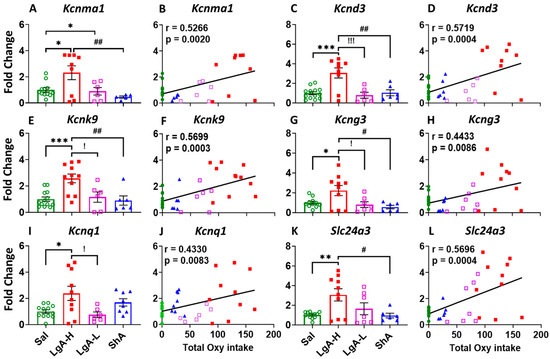 Potassium channels showed increased expression in the dorsal striatum of LgA-H rats. (A) Kcnma1, (C) Kcnd3, (E) Kcnk9, (G) Kcng3, (I) Kcnq1, and (L) Slc24a3. This increased expression of potassium channels was found to positively correlate with oxycodone intake (B) Kcnma1, (D) Kcnd3, (F) Kcnk9, (H) Kcng3, (J) Kcnq1, and (K) Slc24a3. Key to statistics: *, **, *** = p < 0.05, 0.01, 0.001, comparison LgA-H, LgA-L, or ShA to saline rats; #, ## = p < 0.05, 0.01, comparing LgA-H to ShA rats; !, !!! = p < 0.05, 0.001 comparing LgA-H to LgA-L rats.