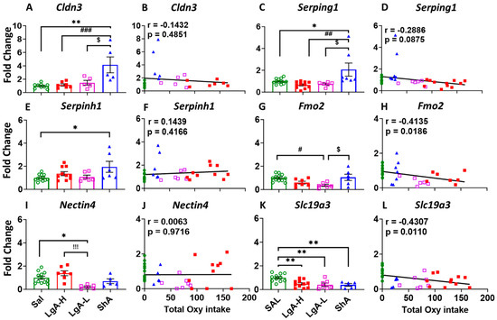 Real-time quantitative PCR of DEGs of other genes. (A) Cldn3, (C) Serping1, and (E) Serpinh1, showed changed expression, which was not correlated with oxycodone intake, illustrated in (B) Cldn3, (D) Serping1, and (F) Serpinh1 in ShA rats. (G) Fmo2, and (I) Nectin4 showed decreased expression in the dorsal striatum of LgA-L rats, with (H) Fmo2 but not (J) Nectin4 showing negative correlation with oxycodone intake. (K,L) Expression of Slc19a3 was decreased in all oxycodone-exposed rats, without any correlation with oxycodone intake. Key to statistics: *, ** = p < 0.05, 0.01, comparison of LgA-H, LgA-L, or ShA to saline rats; #, ##, ### = p < 0.05, 0.01, 0.001 comparing LgA-H rats to ShA rats; $ = p < 0.05, comparison of LgA-L rats to ShA rats; !!! = p < 0.001, comparison of LgA-H rats to LgA-L rats.