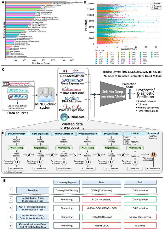 (A): Number of cases for each cancer type, highlighting variation in sample sizes across cancers. (B): Patient survival in years, with each line representing an individual patient, marked as censored or dead, and grouped by cancer type. (C): Overview of the SeNMo framework. The data from public and private sources are collected using Multimodal Integration of Oncology Data System (MINDS) [3] and curated to develop the multiomics dataset. The learned model weights are later used for different downstream prognostic and diagnostic tasks. (D): Features processing pipeline for six data types. Initial modality features reduced through preprocessing are unified at pan-cancer level to yield unimodal pan-cancer feature sets, which are further unified across modalities, resulting in a multiomics matrix of 80,697 features. (E): Study design and simulations for SeNMo across different learning regimes, datasets, and tasks. The baseline model (row 1) is first trained on TCGA data with 33 cancer types for overall survival prediction. Rows 2–5 represent in-distribution data/task (same as baseline) and out-of-distribution data/task (different from baseline) variations: red-bordered boxes indicate a change from the baseline, while green-bordered boxes align with the baseline.