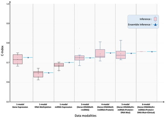 For the OS task, the pan-cancer data was randomly divided into the training-validation set () and the hold-out test set () for each cancer type. The pan-cancer training was carried out by combining the training-validation cohort of all 33 cancer types and adopting the 10-fold cross-validation with the 80–20% division of samples. The training-validation cohort has 11,050 patients, each having features, comprising the six modalities mentioned earlier. For the evaluation/testing of the trained model, the inference data was created by combining the held-out test set from all 33 cancer types, resulting in 2754 patients. We tested the optimal hyperparameters of our trained model to train different combinations of the pan-cancer data modalities. We call these 1-modal, 3-modal (gene expression, DNA methylation, miRNA expression), 4-modal ( protein expression), 5-modal ( DNA mutation), and 6-modal (all modalities) cohorts. Although our initial model was trained on all 6 modalities, these experiments aim to see how the model performs on each of these pan-cancer cohorts where one or more of the data modalities is missing.