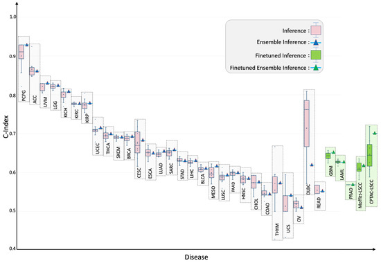 Tumor-specific generalization: Applied cancer by cancer on the held-out test set for each of 33 tumor types, the six-modal model achieved statistically significant () C-indices in 29 cancers (Figure 3; Table 1). The best performance occurred in pheochromocytoma and paraganglioma (TCGA-PCPG) with test/ensemble C-indices of . Four cohorts (GBM, LAML, PRAD, TGCT) initially fell below significance. Targeted fine-tuning for ten epochs raised the C-indices for GBM, LAML, and PRAD to , , and , respectively, while TGCT was still not statistically significant (i.e., ) and proved to be a failure case for this study.