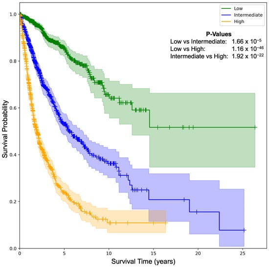Kaplan–Meier (KM) survival curves illustrating SeNMo-driven risk stratification on the pan-cancer data. Patients are partitioned into low, intermediate, and high-risk terciles using the 33rd and 66th percentiles of predicted hazard scores. Survival trajectories diverge markedly across strata. The p-values from logrank test for Low vs. Intermediate: , Low vs. High: , and Intermediate vs. High: . The shaded areas around each curve depict the 95% confidence intervals.