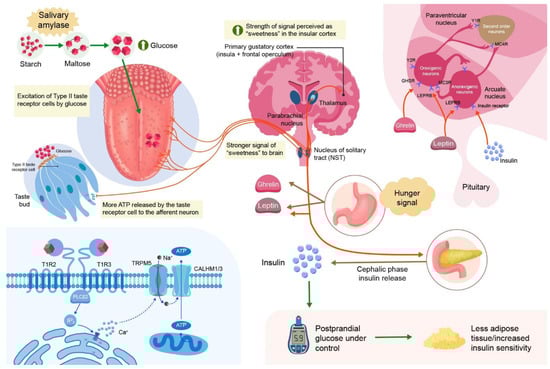 Recent studies have drawn attention to salivary α-amylase (SAA)—an enzyme predominantly produced by the salivary glands and encoded by the AMY1 gene—as a potential metabolic biomarker [,]. Traditionally recognized for its role in the initial digestion of dietary starch in the oral cavity, SAA has emerged as a functionally relevant modulator of postprandial glycemia and insulin dynamics [,,]. Interindividual variability in SAA, largely driven by AMY1 gene copy number variation [], has been associated with differences in glycemic response, visceral adiposity, and susceptibility to obesity and related metabolic disorders [].