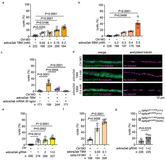 2.6. adora2ab Depletion Induces Cystogenesis and Disrupts Ciliary Morphology