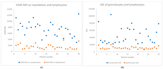 - Guo, J.; Wang, H.; Xiong, S.; Zhang, X.; Zhang, C.; Yang, D.; Zhang, J.; Zhai, Z. Simplified flow cytometry scoring for diagnosis and prognosis of myelodysplastic symptom. Am. J. Transl. Res. 2020, 12, 7449. Available online: https://pmc.ncbi.nlm.nih.gov/articles/PMC7724332/ (accessed on 16 November 2024).