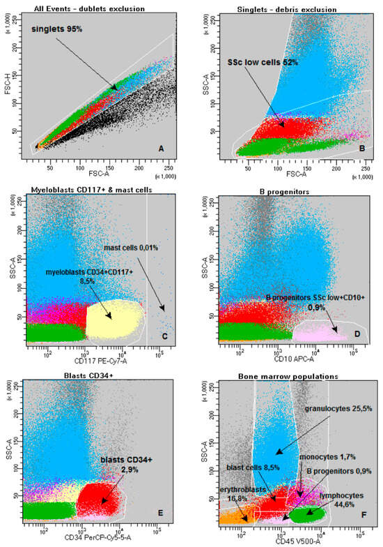 - Porwit, A.; Béné, M.C.; Duetz, C.; Matarraz, S.; Oelschlaegel, U.; Westers, T.M.; Wagner-Ballon, O.; Kordasti, S.; Valent, P.; Preijers, F. Multiparameter flow cytometry in the evaluation of myelodysplasia: Analytical issues: Recommendations from the European LeukemiaNet/International Myelodysplastic Syndrome Flow Cytometry Working Group. Cytom. Part B Clin. Cytom. 2023, 104, 27–50. [Google Scholar] [CrossRef]