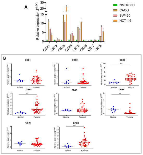 As a first step, we evaluated the expression levels of the CBX family members (CBX1–8) in CRC cell lines (HCT116, SW480, and CACO-2) compared to the non-cancerous colonic epithelial cell line NCM 460D. As shown in Figure 1A, most CBX genes were upregulated in CRC cell lines. Notably, CBX6 and CBX7 were the only members lower expressed across all CRC cell lines assessed.