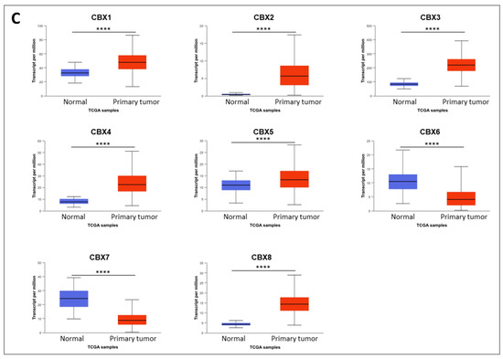 UALCAN is a comprehensive, user-friendly, and interactive web resource for analyzing cancer OMICS data [33]. It is built to provide easy access to publicly available cancer OMICS data (accessed on 23 February 2024). We used it to provide graphs and plots depicting CBX1-8 expression profiles between normal and colon cancer tissues and according to cancer stage. The statistical significance is estimated by Student’s t-test and setting p-value < 0.05.