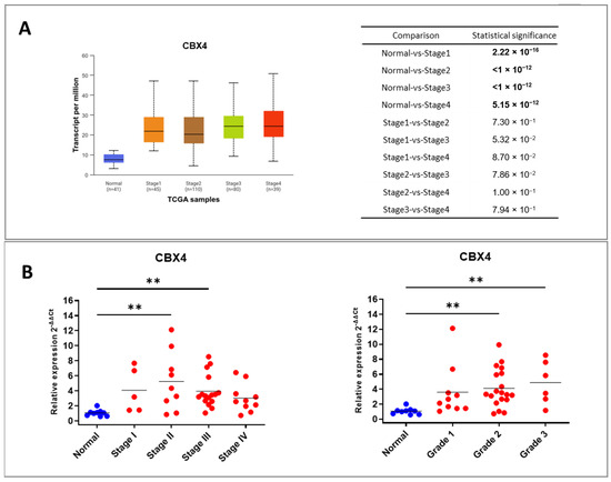 Association between CBX4 expression levels and clinical stage and grade of CRC patients. (A) CBX4 expression analyses performed using the UALCAN dataset with relative statistical comparison among groups. (B) CBX4 expression analyses in a colon cancer cDNA RT-qPCR array consisting of tumor (n = 40) and normal samples (n = 8) stratifying patients according to stage and grade. The star symbol indicates statistical significance (**: p ≤ 0.01).
