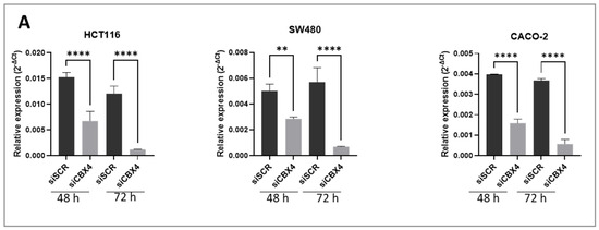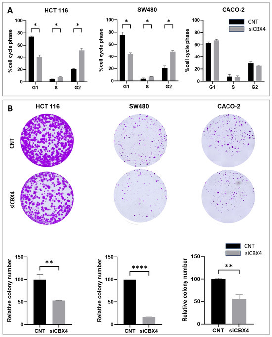 To investigate the functional role of CBX4 in CRC colorectal cancer (CRC), we performed transient silencing using siRNA in three CRC cell lines: HCT116, CACO-2, and SW480. To set up siRNA knockdown experiments, four siRNAs against CBX4 (siCBX4_s1, siCBX4_s2, siCBX4_s3, and siCBX4_s5) were transfected into HCT116 cell line, chosen due to its high expression of protein CBX4. Through Western blot analysis (Supplementary Figure S1), we found that siAURKA-s5 had the strongest knockdown effect compared to the Scramble sequence (siSCR), indicating that this silencing experiment was successful. Based on these results, siCBX4-s5 was selected for all subsequent gene silencing experiments presented in this study. Efficient knockdown of CBX4 was confirmed at both mRNA and protein levels at 48 and 72 h post-transfection in all three cell models (Figure 3A,B). A slight variation in CBX4 expression was observed between 48 h and 72 h in the siSCR group, likely reflecting minor biological variability. However, this did not impact the overall trend. Notably, at 72 h, CBX4 expression was consistently and significantly reduced in siCBX4-treated cells compared to both control and scrambled siRNA groups, confirming the effectiveness of the silencing (Figure 3B). Silencing of CBX4 resulted in a significant reduction in cell proliferation compared to control cells (Figure 3C), as assessed by ATP Lite assay. Cell cycle analysis by flow cytometry revealed an accumulation of cells in the G2 phase following CBX4 knockdown (Figure 4A), suggesting a block in cell cycle progression. This G2 arrest was consistently observed across two of three cell lines, HCT116 and SW480 at 72 h post-silencing, whereas no change was detectable in CACO-2 cells. However, colony formation assays demonstrated a marked decrease in the number and size of colonies in all CBX4-silenced cells (Figure 4B), indicating impaired clonogenic potential. Collectively, these results indicate that CBX4 contributes to CRC cell proliferation and cell cycle progression, and its silencing impairs tumorigenic potential by inducing G2 phase arrest and reducing long-term proliferative capacity.