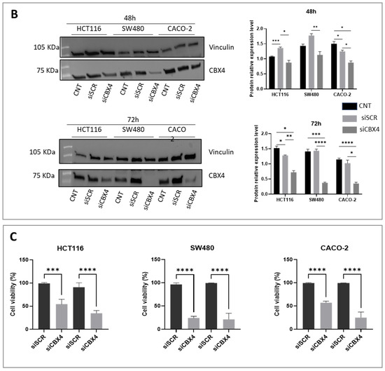 Knockdown efficiency of siCBX4. (A) Analysis of the knockdown efficiency of siCBX4 assessed by RT-PCR in three colon cancer cell lines after 48 h and 72 h. (B) Analysis of the knockdown efficiency of siCBX4 assessed by Western blot after 48 h and 72 h, with relative densitometry of CBX4 protein expression. (C) Effect of CBX4 silencing on cell viability assessed by ATP Lite assay after 48 h and 72 h. The star symbol indicates statistical significance (*: p ≤ 0.05, **: p ≤ 0.01, ***: p ≤ 0.001, ****: p ≤ 0.0001).