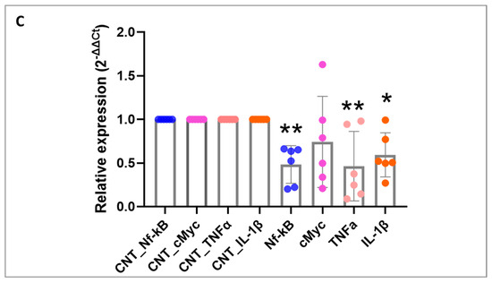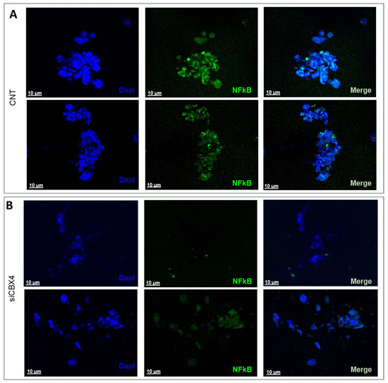 Immunofluorescence analysis was conducted to evaluate NF-κB expression in 3D PDO models of CRC. In untreated PDOs, NF-κB displayed strong nuclear localization (Figure 6A). Following siCBX4, a substantial reduction in NF-κB signal was observed (Figure 6B), indicating that CBX4 may positively regulate NF-κB activity. To validate this observation at the transcriptional level, qPCR analysis was performed to measure NF-κB mRNA expression. A significant downregulation of NF-κB transcripts was detected in CBX4-silenced samples compared to controls. Given that NF-κB activation can be driven by upstream factors such as the pro-inflammatory cytokines TNF-α and IL-1, as well as the oncogene c-Myc, we also quantified the expression of these genes. CBX4 knockdown resulted in reduced expression of TNF-α, IL-1, and c-Myc, suggesting that CBX4 may regulate NF-κB activation through modulation of its upstream signaling components (Figure 6C).