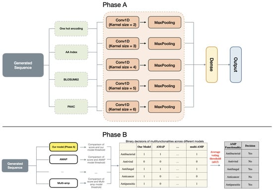 The architecture of the multifunction predictor. (Phase A): Our model uses four distinct encoding methods to independently process AMP sequences, with their embeddings fused through neural network integration; the aggregated features then pass through fully connected layers to simultaneously predict all five functional attributes. (Phase B): The system incorporates predictions from established AMP classifiers (AMAP, multi-AMP, etc.), where each model applies its own predefined threshold to convert scores to binary decisions before majority voting determines the resulting multifunction profile. This dual-phase design combines deep feature learning with robust cross-model validation.
