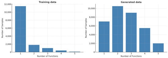 Our generative model produced a total of 139,389 AMP sequences. Among these, 35,448 were predicted to be positive AMPs, as illustrated in Figure 2, while the remaining 103,941 were classified as negative. We then performed multifunctional prediction on the positive AMP sequences to assess their functional diversity. Figure 3 compares the number of predicted functions per sequence between the training dataset and the generated dataset. In the training data, most AMPs possess only one function, with a steep drop-off beyond two functions. In contrast, the generated AMPs display a diverse functional distribution, with most sequences predicted to possess two or three functions. A smaller number exhibit broader multifunctionality, with some predicted to have all five functional activities.