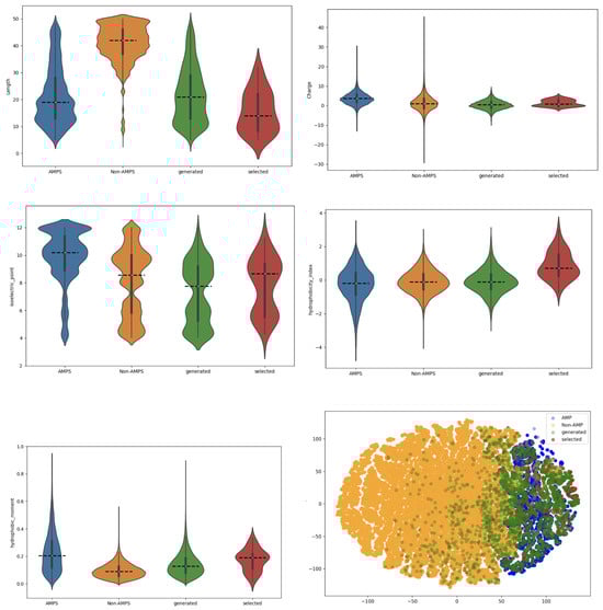 As shown in Figure 4, we analyzed and compared the physicochemical properties of real AMPs, non-AMPs, generated AMPs, and the top 50 peptides with the highest number of predicted functions. The evaluated features included sequence length, net charge, isoelectric point, hydrophobicity index, hydrophobic moment, and a t-SNE projection derived from these properties.