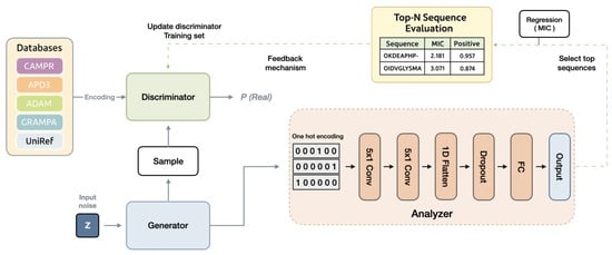 The FBGAN architecture functions as follows: During each epoch, the analyzer acquires a specific number of sequences from the generator. Following evaluation, the analyzer selects the top n sequences to refresh the discriminator’s training set, replacing the oldest n sequences. This iterative process occurs in every epoch, progressively enhancing the discriminator’s dataset with top-scoring sequences. Consequently, the model gradually shifts towards generating AMP sequences that exhibit the desired attributes.