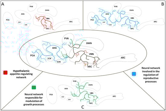 Selected neural networks in the hypothalamus. Shared area of neural networks—black lines; neural network involved in the regulation of energy homeostasis—red lines (A). Neural network involved in the regulation of reproductive processes—blue lines (B). Neural network responsible for the modulation of growth processes—green lines (C). PVN—paraventricular nucleus, VMN—ventromedial nucleus, DMN—dorsomedial nucleus, ARC—arcuate nucleus, POA—preoptic area, AHA—anterior hypothalamic area, SCN—suprachiasmatic nucleus, SON—supraoptic nucleus.
