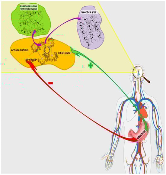 The mediobasal hypothalamus (MBH) contains a few specialized neuronal populations that play a critical role in metabolic regulation and energy homeostasis []. Among others, two main neuronal subpopulations have been identified in the ARC: the first coexpresses neuropeptide Y (NPY) and agouti-related peptide (AgRP; NPY/AgRP neurons), while the second coexpresses cocaine- and amphetamine-regulated transcript (CART) and α-melanotropin (α-MSH; CART/α-MSH neurons). These neurons send their axonal projections to multiple hypothalamic regions, including the PVN, VMN, POA, and AHA [,,,], and are involved in the regulation of food intake and energy expenditure [,].