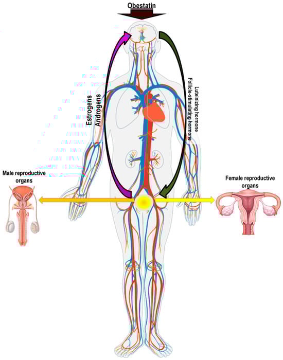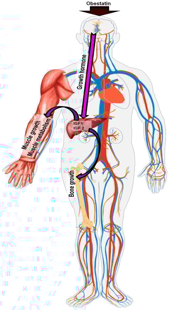 The current literature lacks information on the potential therapeutic effects of obestatin in the neuroendocrine systems discussed in this review, namely the appetite regulation system and the somatotrophic and gonadotrophic axes. Nonetheless, there are some findings that suggest this peptide may be involved in therapeutic applications across various physiological systems. In a study conducted on rats with type 2 diabetes, it was demonstrated that obestatin administered over a period of 30 days had a modulatory effect on blood insulin and glucose concentrations. These findings suggest that obestatin represents a promising therapeutic target for the treatment of metabolic disorders, including diabetes and obesity [,]. However, future research could be expanded to investigate how obestatin interacts with the hypothalamic center involved in the regulation of food intake, particularly in the context of diabetes and feeding disorders like obesity. Interestingly, and relevant to the topic of obesity, obestatin appears to have an influence on atherosclerotic cardiovascular disease. It shows that obestatin may have a cardioprotective role, could impact on controlling blood pressure, and also enhances papillary muscle contractility and beta-adrenergic responsiveness, but only in type 1 diabetic rats []. Other studies have demonstrated that obestatin administration in rats fed a high-fat diet can protect against non-alcoholic fatty liver disease []. More interestingly, obestatin also shows neuroprotective properties and, by improving the function of dopaminergic neurons, it alleviates the progression and symptoms of Parkinson’s disease []. Since this peptide demonstrates properties influencing memory retention, vasodilation, and neuronal survival, further studies could be extended to investigate its effects on the neuroendocrine systems as well as the reward system. Interestingly, a therapeutic application for obestatin has also been found in muscle regeneration through the stimulation of satellite stem cells and myofiber hypertrophy [].