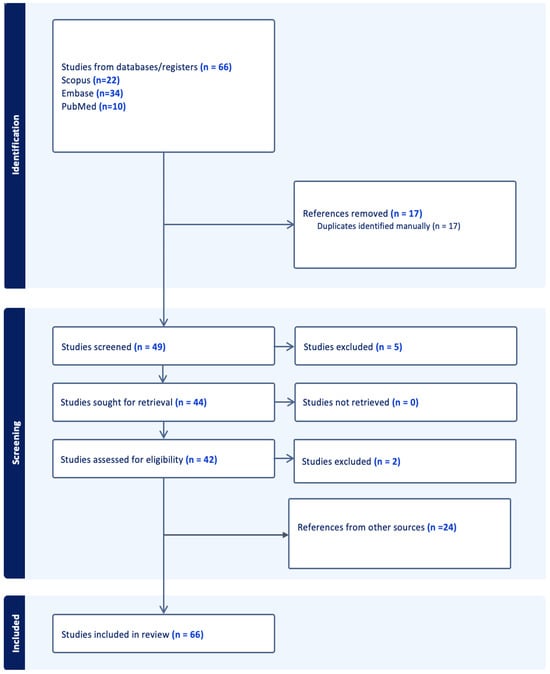 Articles were selected based on their thematic relevance to AI-enhanced theranostic approaches in neuro-oncology. Additional key studies were manually included to ensure completeness. The final manuscript cited 66 references. The workflow process can be found in Figure 1.