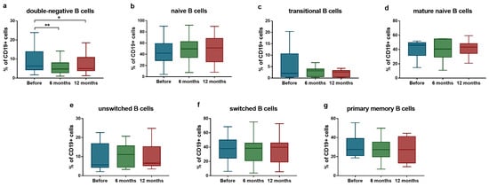 Regarding B cell subsets, a significant reduction was detected in the proportion of IgD−CD27− double-negative B cells (median: 6.3% [Q1–Q3: 4.3–13.9%] vs. median: 4.8% [Q1–Q3: 2.8–8.0%]; p = 0.004 after 6 months; and median: 6.3% [Q1–Q3: 4.3–13.9%] vs. median: 5.0% [Q1–Q3: 3.9–10.9%]; p = 0.039 after 12 months) (Figure 2a). No significant changes were observed in other B cell populations during the follow-up period (Figure 2b–g).