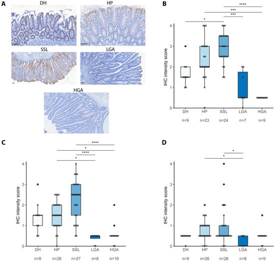 - Rickelt, S.; Condon, C.; Mana, M.; Whittaker, C.; Pfirschke, C.; Roper, J.; Patil, D.T.; Brown, I.; Mattia, A.R.; Zukerberg, L.; et al. Agrin in the Muscularis mucosa serves as a biomarker distinguishing hyperplastic polyps from sessile serrated lesions. Clin. Cancer Res. 2020, 26, 1277–1287. [Google Scholar] [CrossRef]