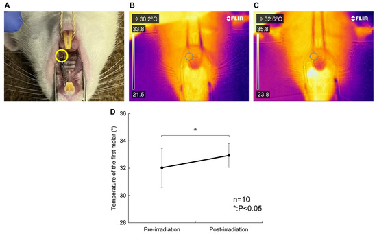 Effects of diode laser irradiation on temperature. (A) The temperature of the upper left first molar of the rat, the irradiated site (yellow circle), was measured. (B) FLIR camera thermogram before irradiation. The measured temperatures are shown in the upper left. (C) FLIR camera thermogram after irradiation. The measured temperatures are shown in the upper left. (D) The temperature of the periodontal tissue increased significantly post-irradiation compared with pre-irradiation (32.0 ± 1.4 vs. 32.9 ± 0.9 °C, p < 0.05). The average temperature change was +0.9 °C, and no increase of more than 2.4 °C was observed. n = 10. * p < 0.05, compared to pre-irradiation (Wilcoxon signed-rank test).
